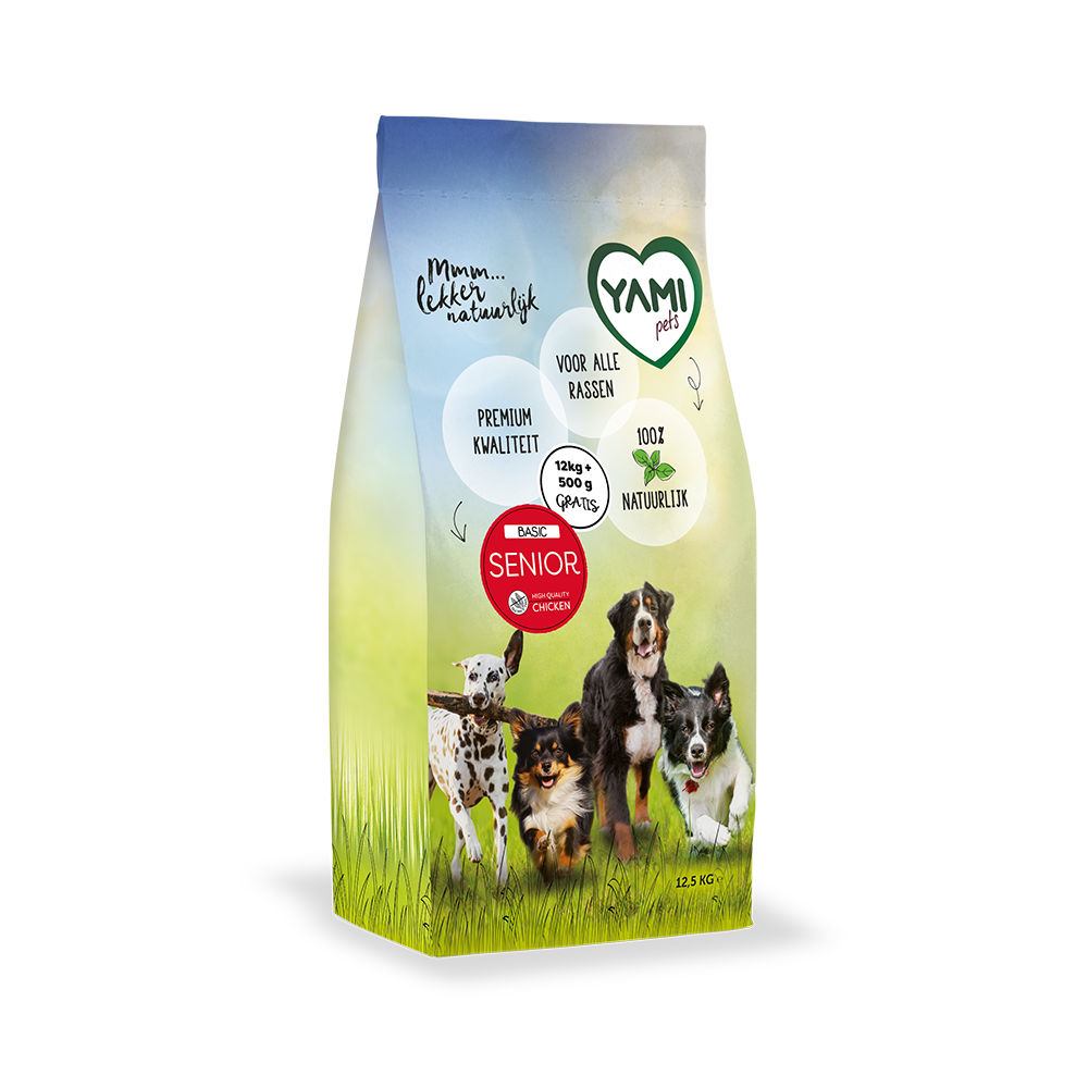 YamiPets Basic Senior is een volledige voeding voor honden vanaf 8 jaar op basis van kip.